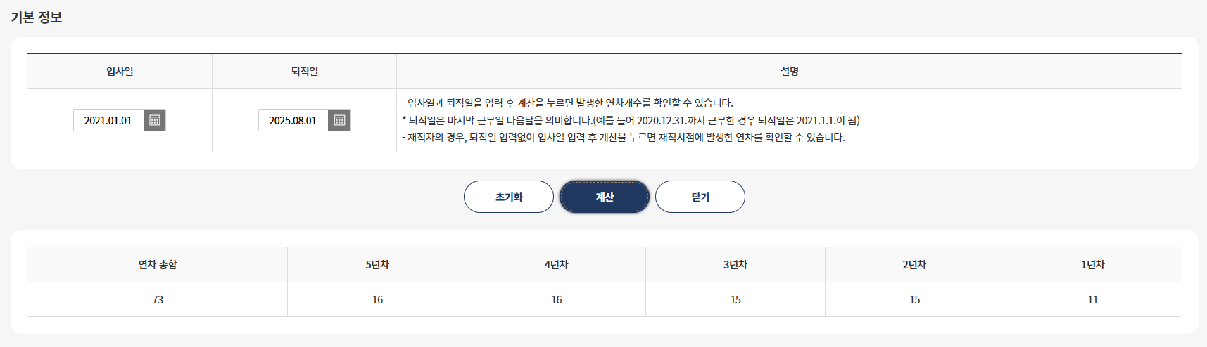 | 고용노동부 연차계산기 | 법정 연차 발생일, 유효 기간 확인 | 기본 연차 확인, 법적 권리 확인 |